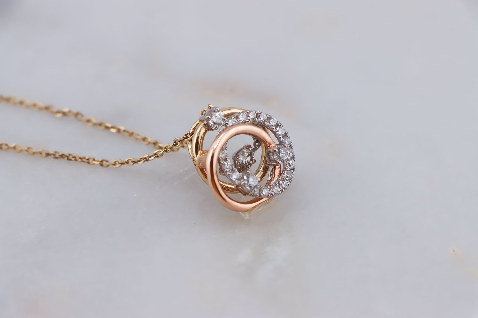 The centerpiece of the necklace is a unique "always in motion" diamond, set at the heart of the interlocking rings. This special diamond is expertly mounted to ensure that it shimmers and glimmers with the slightest movement, creating a mesmerizing and captivating effect.